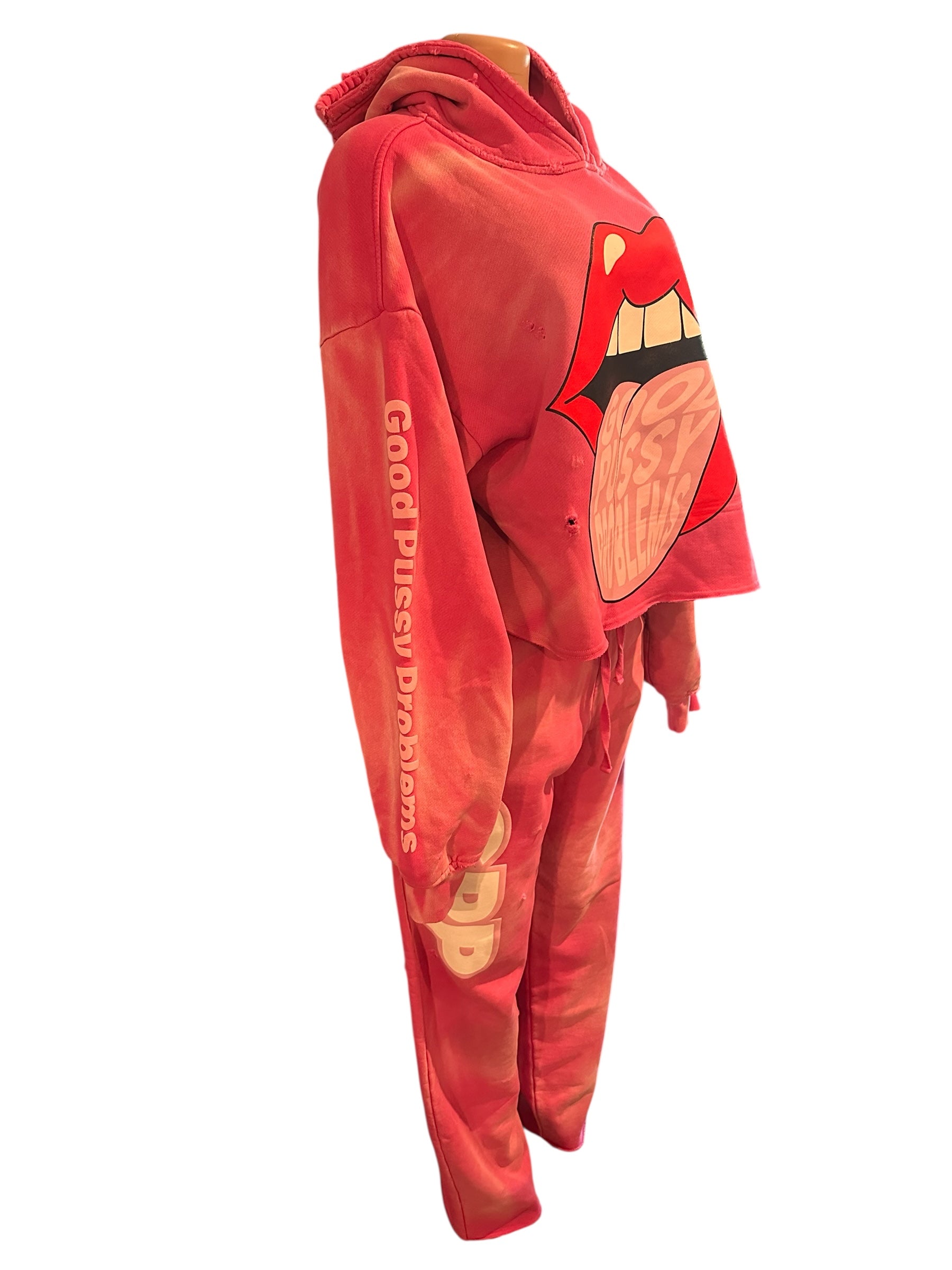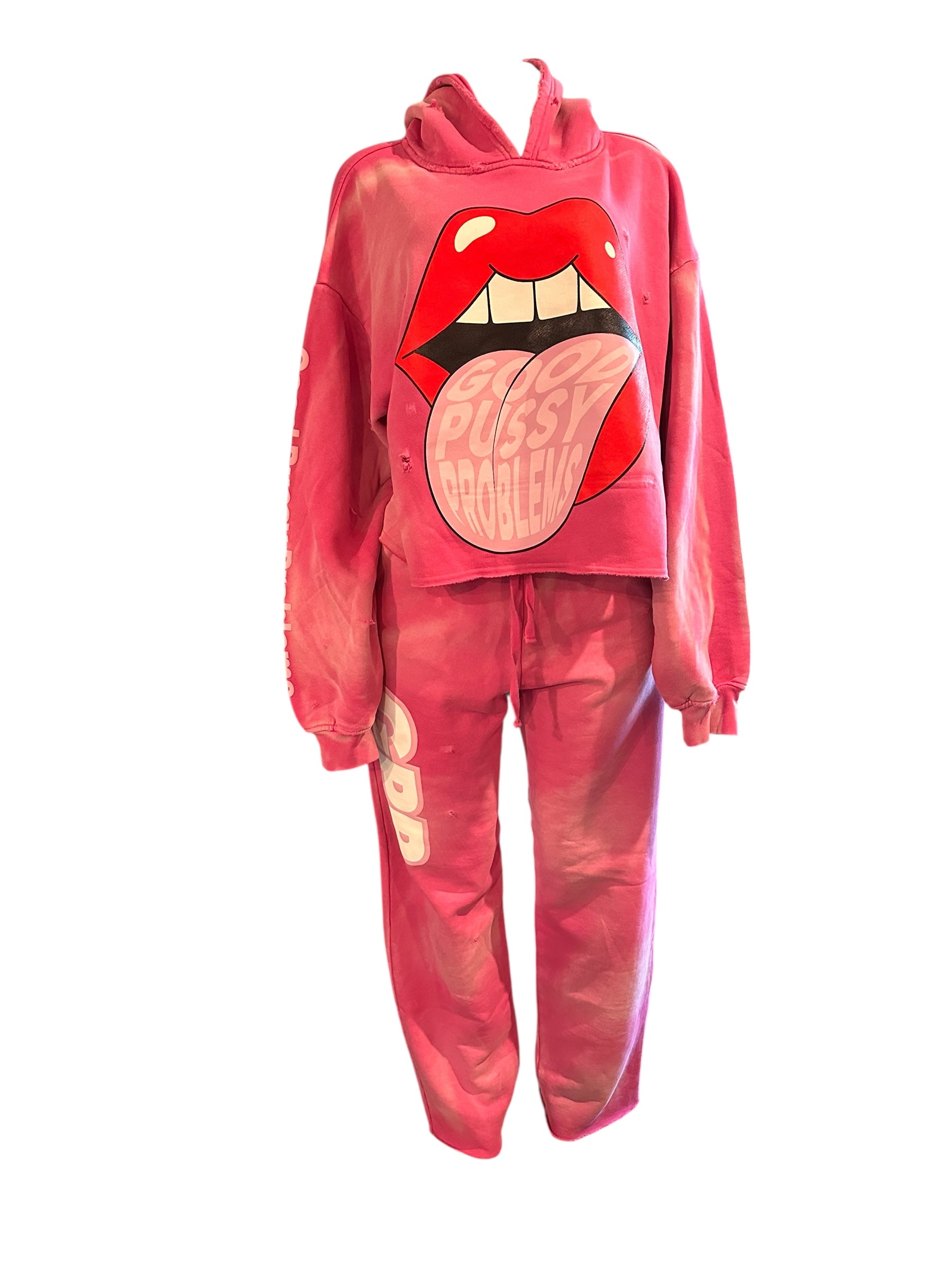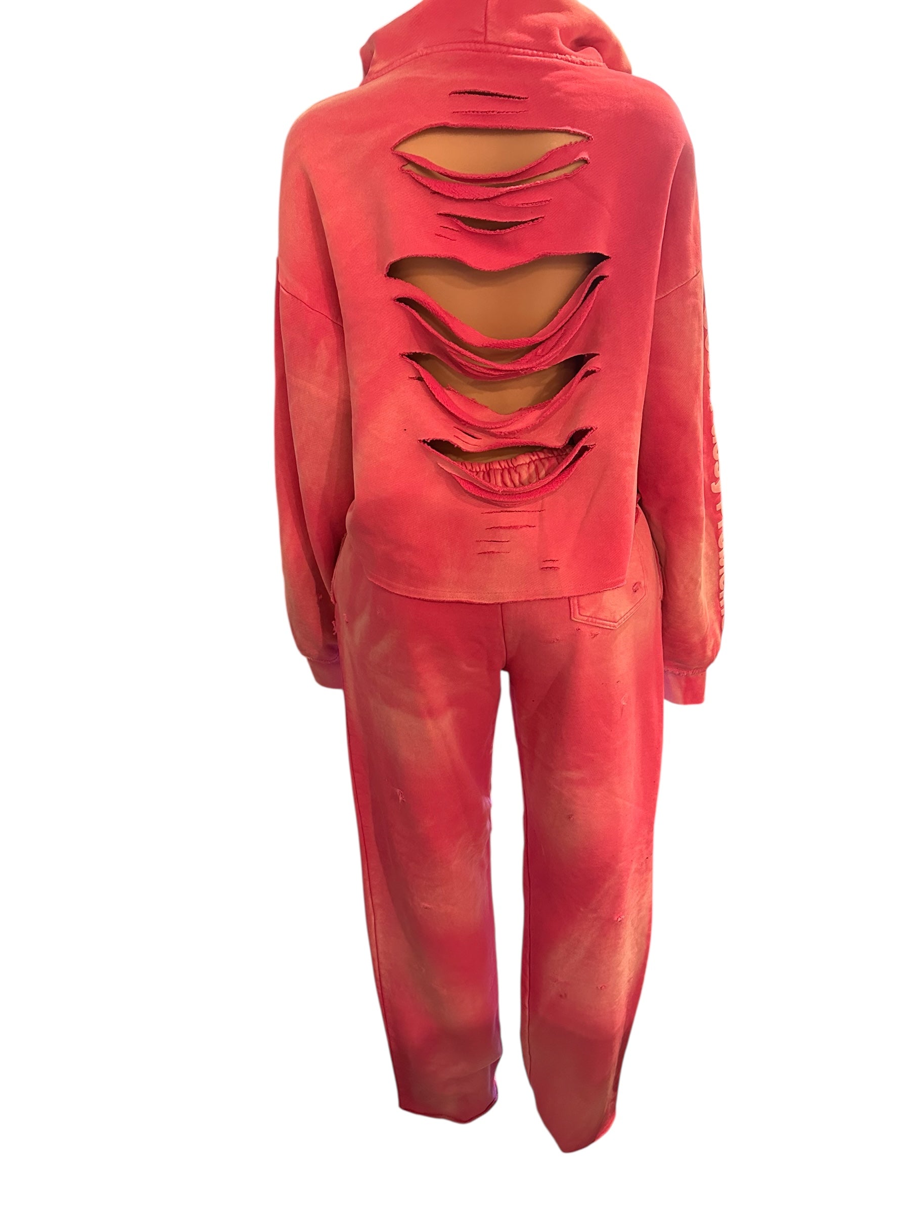 One available pink special edition sweatsuit ! The quality of the suit is very heavy thick material! Only 3 made in colors pink, white and black ! All large size only! All have custom cuts in the back of the hoodie!